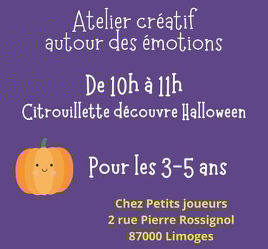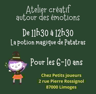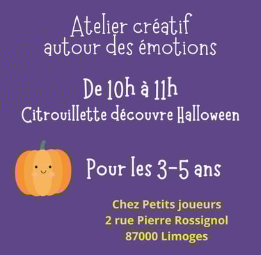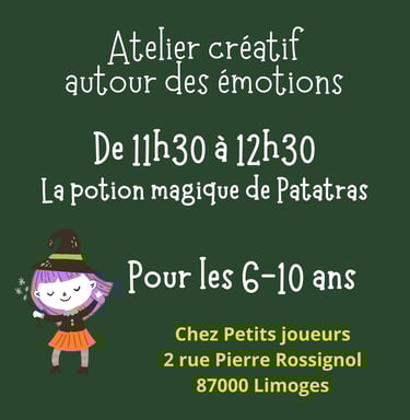 Aussi, je propose des ateliers créatifs, afin d'offrir aux enfants un temps durant lequel ils peuvent conscientiser les manifestations des émotions de base telles que la tristesse, la peur, la colère, la joie... et peuvent, par le geste, extérioriser ce qu'ils ressentent.